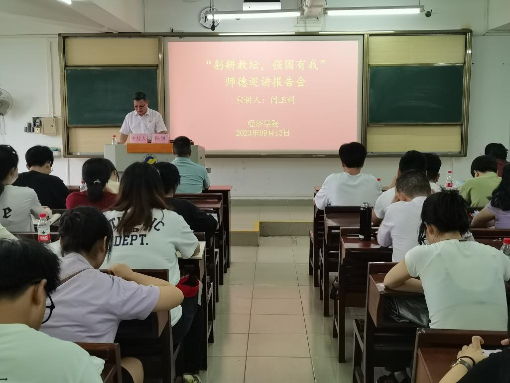 9月13日下午,必赢线路检测3003no1在广学楼709召开了“躬耕教坛,强国有我”师德巡讲报告会。学校宣讲团成员、必赢线路检测3003no1教授闫玉科受邀做了题为《高等学校教师职业道德规范》的专题报告。学院领导、全体教职员工共70人参加了会议。学院党委书记陈创主持了会议。