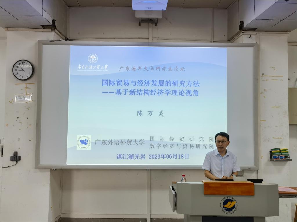 开幕式后,陈万灵和廖泽芳两位教授先后做了主题报告。陈万灵在报告中以《国际贸易与经济发展的研究方法:基于新结构经济学理论视角》为题,以问题为导向,结合丰富的事例,深入浅出的讲解了国际贸易与经济发展的一般研究逻辑、经济发展的结构问题、新结构经济学(新结构主义发展经济学)和国际贸易结构与经济发展的研究方法等内容。廖泽芳则以《全球贸易调整下中国对外开放与自贸区特色口岸构建》为题,从分析复杂多变的国际环境引出,运用详实的数据和大量的案例,全面分析了世界贸易格局与中国地位、当前国际贸易与分工趋势对中国的机遇与挑战、中国新一轮开放策略:自贸区建设及边境合作区特色口岸构建以及贸易赋能产业经济,融合构建自贸区与特色口岸新格局等内容。两位专家的主题报告,让与会研究生进一步理清了学习和科研思路,认清了经济贸易领域的前沿动态,拓展了学术知识视野,夯实了学术研究基础。