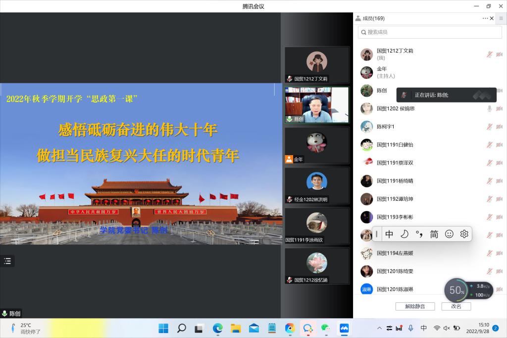 9月28日下午,必赢线路检测3003no1党委书记陈创利用腾讯会议面向学院入党积极分子、第七期“青马工程”培训班学员共168名学生线上讲授了新学期“思政第一课”。
