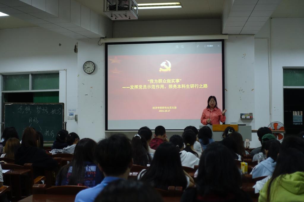 会上,党支部5位研究生代表向本科生们分享了考研经验。2020级应用经济学专业研究生周俊杰作为推免生代表分享了他的保研经验。他提到了成绩、科研对于本科生推免的重要性,并强调在注重学习成绩的同时也不能忽略自身能力的培养;2021级应用经济学专业研究生郑晓欣分享了本科期间各阶段如何做好学习和考研规划,并提出要以兴趣为导向找寻研究方向;2021级应用经济学研究生张云慧从了解自身需求切入,通过价值需求导向的不同选择分析了如何择校、度过本科生活;2021级农村发展专业研究生谢庆贤认为考研是一场自我的修行,在确定人生目标的同时更要做好选择,明确自身目标并一以贯之;2021级农村发展专业研究生蒋文杰则围绕“念想、梦想、执念”分析了对于考研的不同选择和结果,并结合案例生动形象地介绍了“计划—目标—执行”的关系及实际运用。