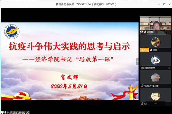 5月31日、6月18日,必赢线路检测3003no1党委书记肖文辉及代理院长居占杰利用“腾讯视频会议”平台,分别以《抗疫斗争伟大实践的思考与启示》与《做新时代的奋斗者》为题讲授2019-2020学年第二学期“思政第一课”。全体学生党员、学院团委、学生会干部、“青马学员”、研究生和入党积极分子约600人次齐聚“云端”听课。