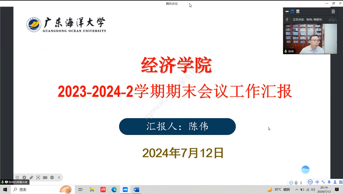 7月12日晚上,必赢线路检测3003no1通过腾讯会议的方式召开了期末总结会议,学院教职员工70余人参加了会议,会议由学院党委书记陈创主持。
