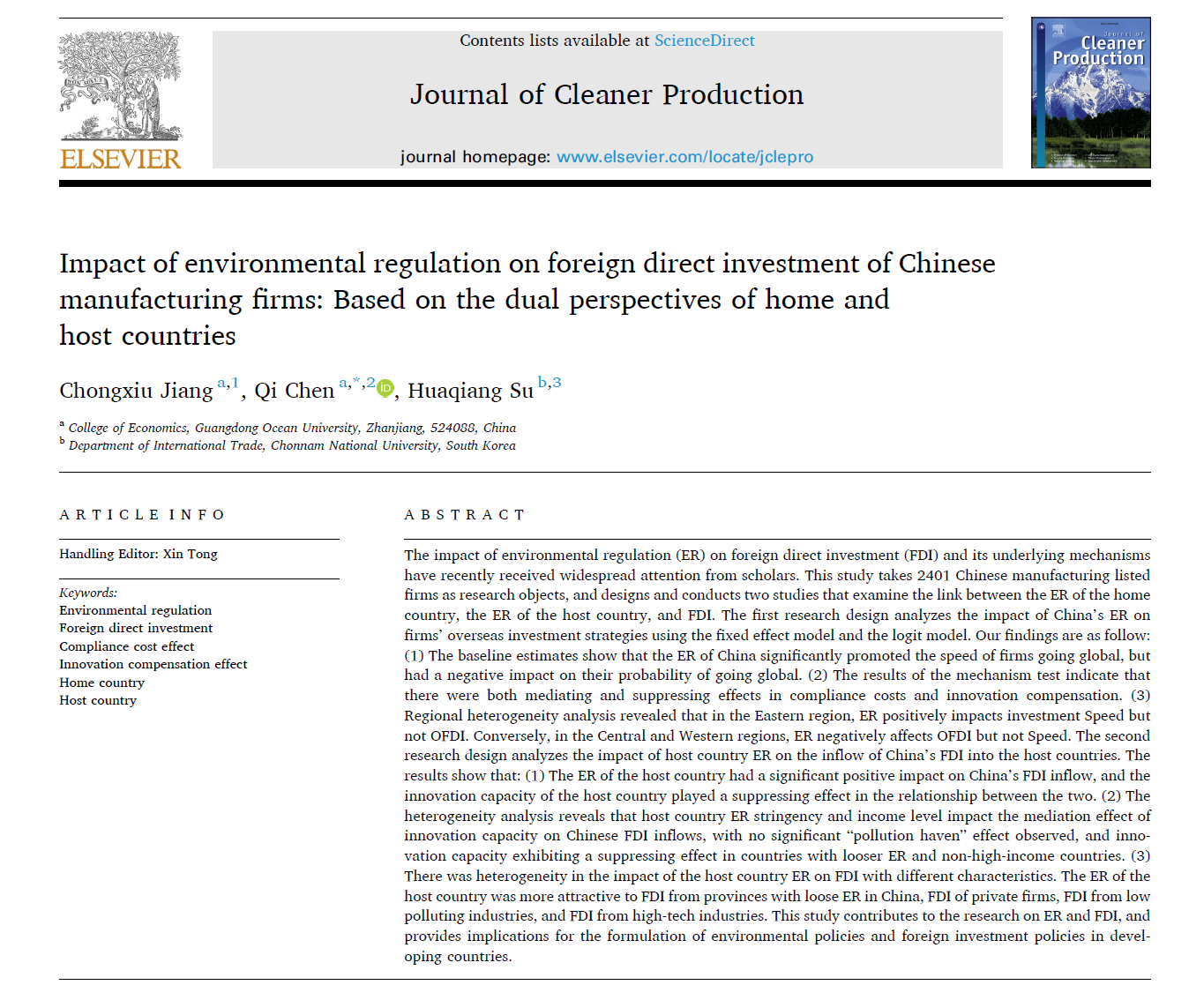 广东海洋大学必赢线路检测3003no1蒋重秀副教授作为第一作者,陈琦老师担任通讯作者,在国际环境科学与生态学领域顶级期刊《Journal of Cleaner Production》(简称JCP)发表题为《Impact of environmental regulation on foreign direct investment of Chinese manufacturing firms: Based on the dual perspectives of home and host countries》的重要研究成果。该期刊2023-2024年最新影响因子为9.8,五年影响因子10.2,位列JCR环境科学与生态学Q1区,同时入选中国科学院分区(2023升级版)一区TOP期刊。这是我院在环境经济与跨国投资交叉研究领域的重要突破。