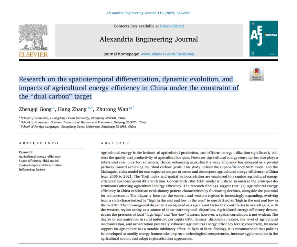 近日,广东海洋大学必赢线路检测3003no1龚征旗教授作为第一作者在国际知名期刊《Alexandria Engineering Journal》(简称AEJ)发表题为《Research on the spatiotemporal differentiation, dynamic evolution, and impacts of agricultural energy efficiency in China under the constraint of the “dual carbon” target》的高水平学术论文。该期刊2023-2024年最新影响因子为6.2,位列工程与综合类JCR Q1区,同时入选中国科学院分区(2023升级版)TOP期刊。