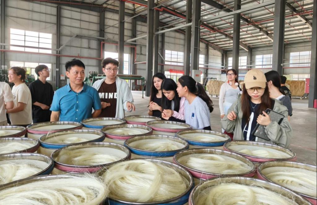 5月8日下午,调研团队来到位于雷州的广东省东方剑麻集团有限公司。该公司作为国内剑麻产业的龙头企业,其产品远销全球市场。师生们深入剑麻种植基地和加工车间,了解剑麻纤维的生产流程及国际市场战略,并就校企合作、人才培养等达成初步意向。