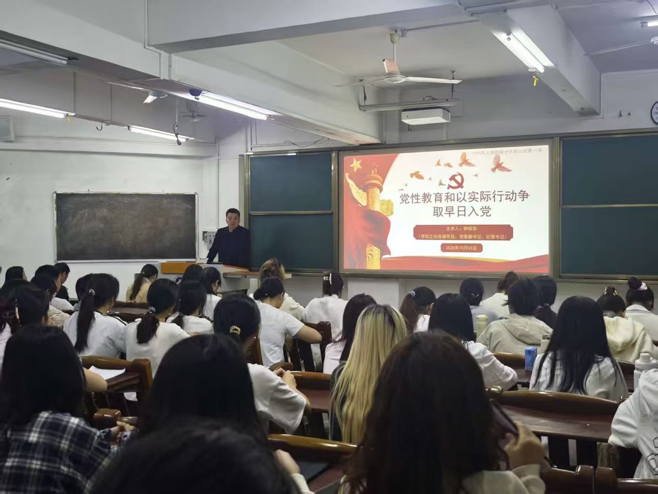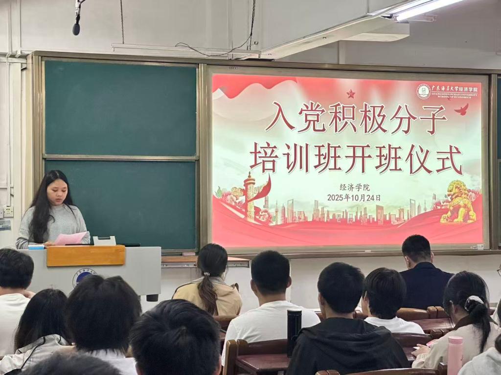 10月24日下午,广东海洋大学必赢线路检测3003no12025年入党积极分子培训班在广学楼401室正式开班。本次培训旨在进一步提升入党积极分子的思想认知水平与理论素养,筑牢信仰之基、补足精神之钙,学院正处级辅导员、党委副书记钟桂安,辅导员叶梦怡、吴金年、温莉莉、陈家敏、肖启映、李斯雯及 97 名入党积极分子共同出席开班仪式,会议由学院兼职组织员、辅导员陈家敏主持。
