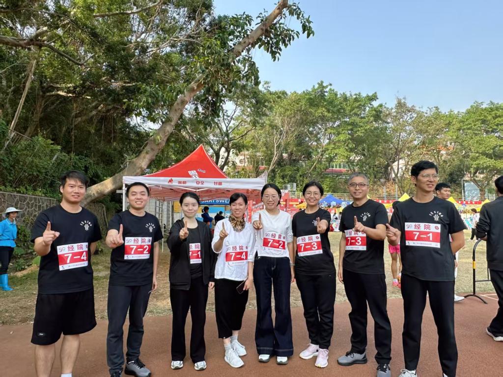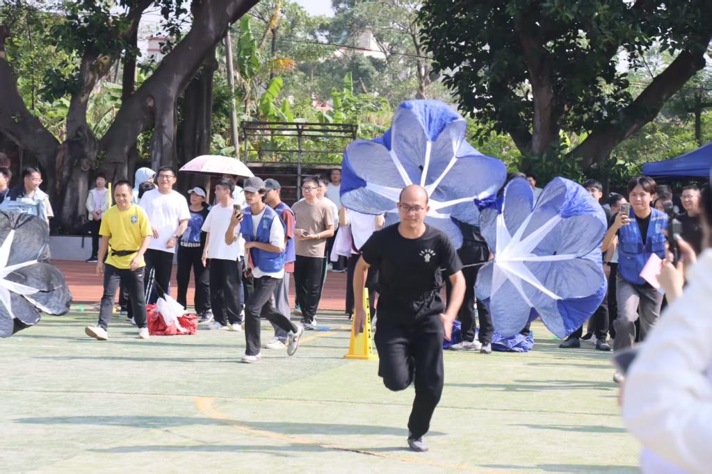 12月5日,我校第26届运动会在湖光校区东区体育场开幕。在开幕式方阵展示环节,60余名教职工身着统一运动服,以“鹰隼试翼,展翅云间,唯我经院,志冲九天”昂扬姿态亮相开幕式,展现出积极向上的集体精神面貌。