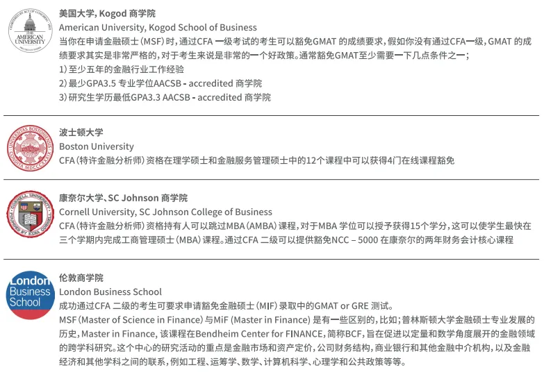 国外商科名校(例如波士顿大学,康奈尔大学,伦敦商学院,多伦多大学等)的商学院在申请留学生时,阶段性通过CFA考试可豁免GMAT的成绩要求,部分学校可获得课程豁免。全球更多CFA合作名校及课程,可查阅CFA协会官网。