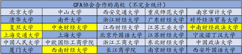 部分国内与CFA协会合作的高校