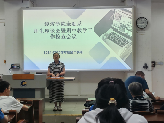 2025 年 5 月 21 日下午,我院金融系于广学楼 231 教室成功举行期中教学检查师生座谈会。金融系全体教师及本科生代表近 50 人出席会议。会议由系副主任邓莅芊老师主持。