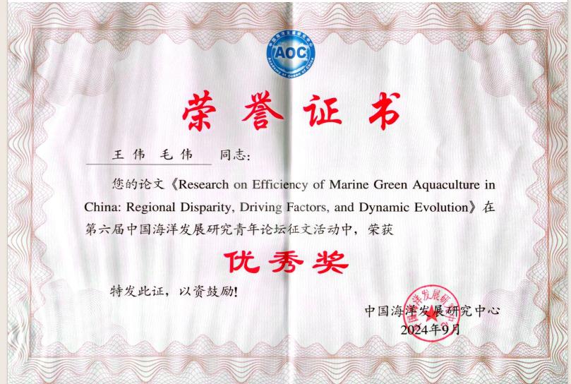 2024年10月9日-10日,中国海洋发展研究中心联合自然资源部海洋发展战略研究所、武汉大学国际法研究所、华东政法大学军事法研究中心举办的第六届中国海洋发展研究青年论坛公布获奖结果。本次论坛的主题为“全球海洋可持续发展与中国海洋战略”,我院研究生王伟在毛伟副教授指导下撰写的《Research on Efficiency of Marine Green Aquaculture in China: Regional Disparity, Driving Factors, and Dynamic Evolution》获优秀论文奖。