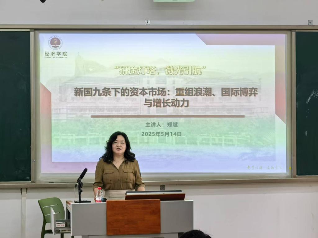 郑斌总经理以《新国九条下的资本市场:重组浪潮、国际博弈与增长动力》为题,结合自身丰富的行业经验,深入剖析了新政策背景下资本市场的发展趋势与机会。他首先以国泰海通证券为例,详细解读了新国九条下企业合并的背景、动因与影响;随后分析了中国资本市场增长的关键动力,最后探讨了“对等关税”政策下国际博弈的特点、机遇与挑战,为学生们提供了前瞻性的行业洞察。